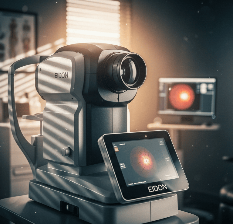 The Eidon retinal imaging camera is an advanced eye imaging device used by optometrists and ophthalmologists to take detailed, high-resolution pictures of the retina—the light-sensitive tissue at the back of the eye. Unlike standard eye exams that primarily look at the front structures of the eye, this camera allows your eye doctor to see deep into the retina, including the optic nerve and blood vessels, without dilation in many cases.